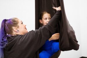 In this youth centered aerial workshop: flyers ages 7-10 will explore beginner moves & poses on the aerial sling. Flyers will learn about aerial safety as well as basic movement & body awareness on the sling.